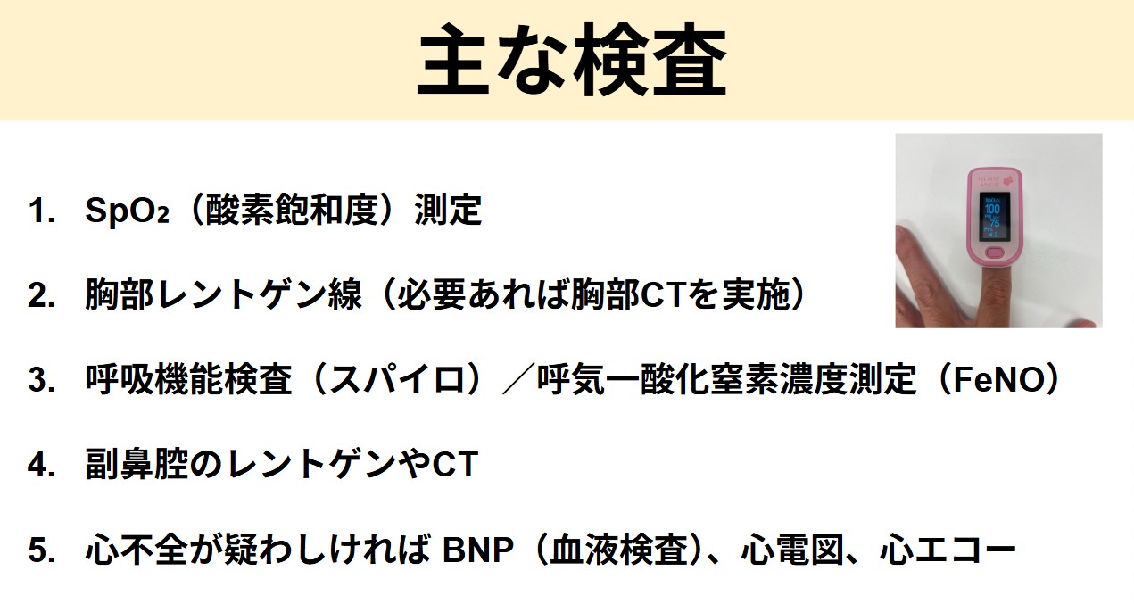 当院では、症状の出方(横になると悪化するタイミング、食後・早朝の咳、鼻症状の有無など)を丁寧に確認したうえで、必要に応じて 胸部レントゲン、呼吸機能検査、気道炎症の評価(FeNO)、アレルギー評価 などを組み合わせ、原因を見極めて適切に治療します。