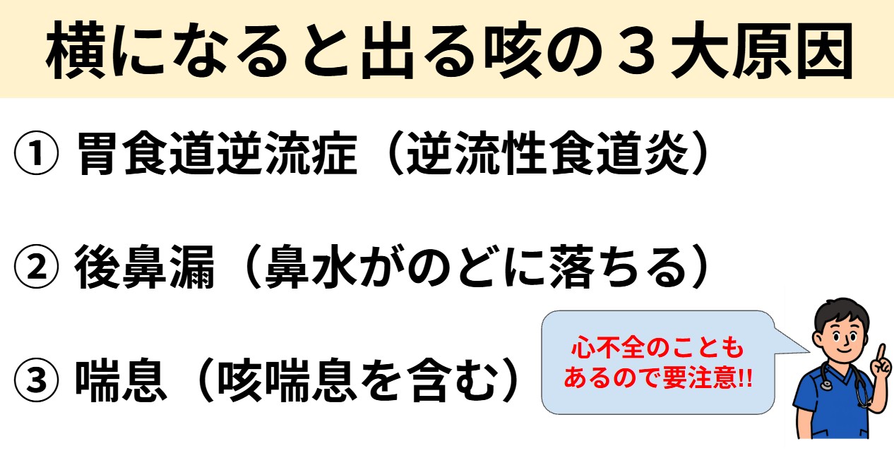 このような条件が組み合わさり、横になると咳が出やすくなります。