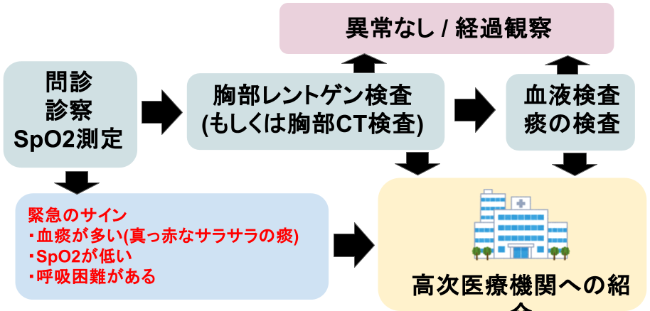 呼吸器内科を受診した際、以下のようなステップで血痰の原因を探っていきます。