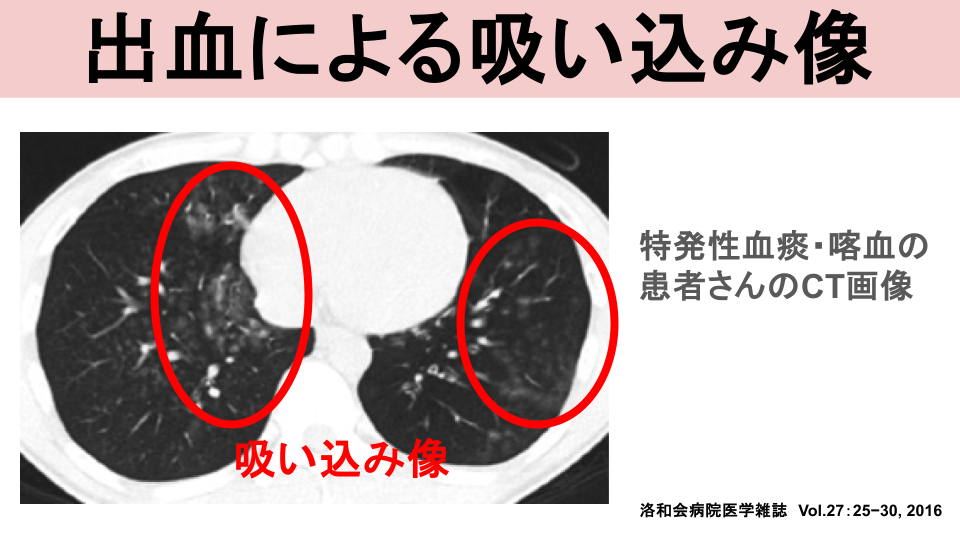 肺炎、肺がん、気管支拡張症、非結核性抗酸菌症、結核による空洞影、などの可能性をチェックします。出血量が多い場合、胸部レントゲンやCTでは吸い込み像と言って、周囲に血を吸い込んだことによる白い淡い影ができることがしばしばあります。吸い込み像がある場合は、ある程度の出血があったことが推定されます。