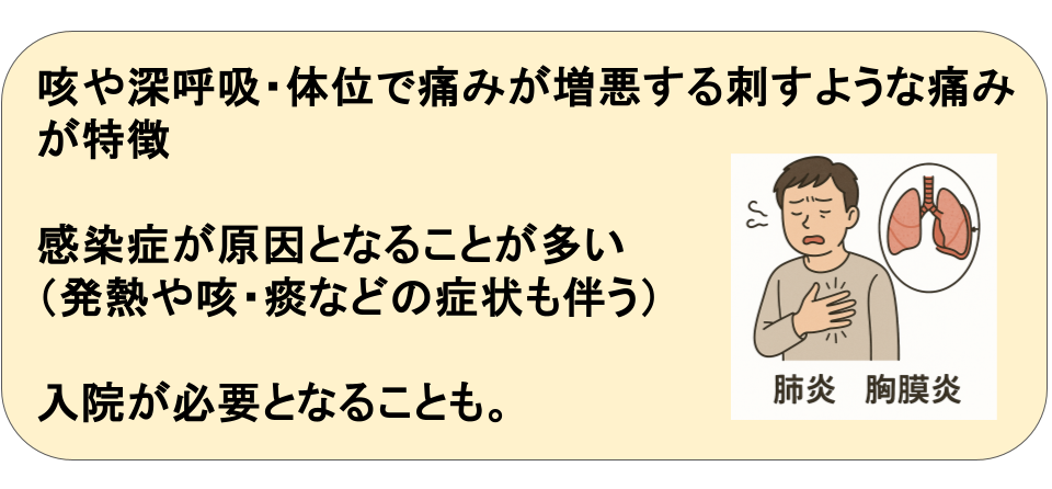 主に肺を包む膜(胸膜)に由来する痛みです。下記が代表的な原因となります。