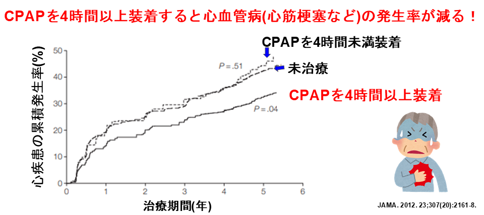 CPAPを装着すると生命予後が改善したというデータがあります。「夜しっかり眠る」=「長生きにつながる」これは科学的にも裏づけられた事実です。