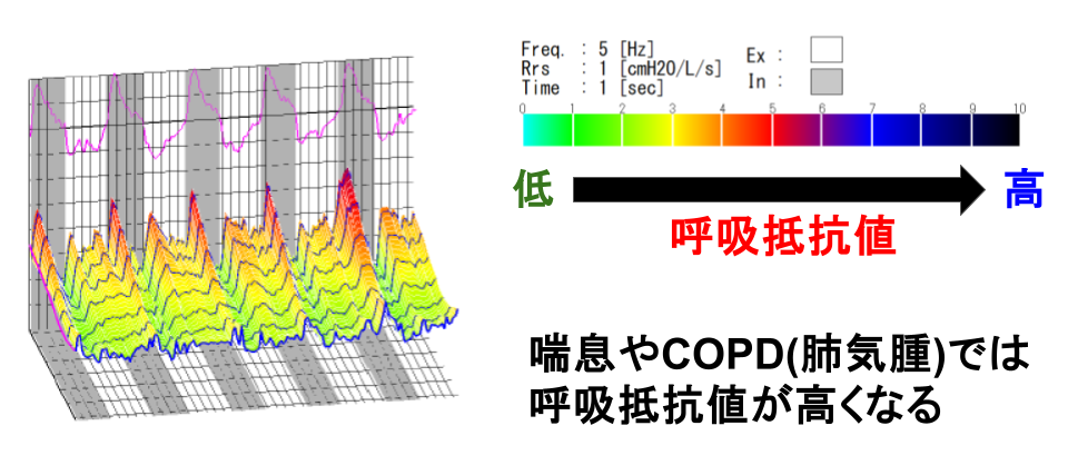 気管支喘息やCOPDでは、気管支がせまくなるため呼吸抵抗値が上昇するため、診断に重要な検査になります。