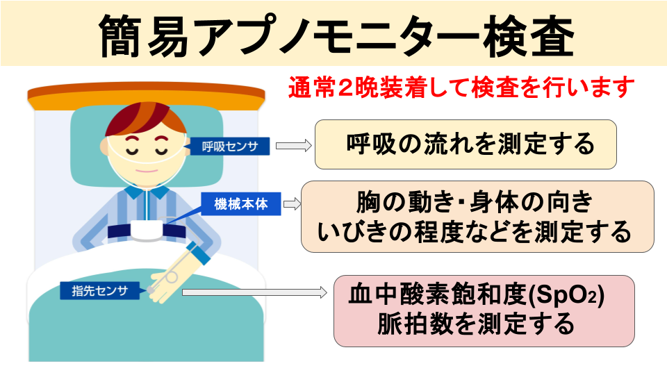 簡易検査(アプノモニター)やポリソムノグラフィー検査(精密検査)を実施しています。いずれも自宅で検査が可能です。
